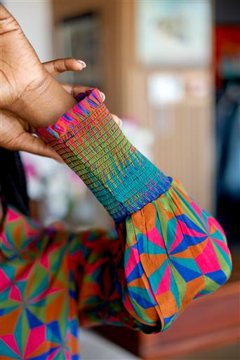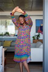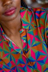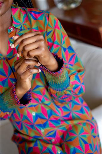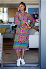 A chic button-down dress with a mandarin collar, elegant Puff sleeves, and a flattering curved hemline.