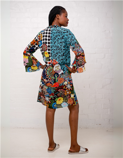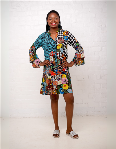 The Symphony Dress features a button-down front and then a 2 tier frill. It has a 2 tier sleeve and a collar, adding to a shirt-like appearance.