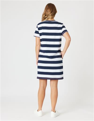 KNEE LENGT DRESSWITH EMBROIDERED WORDING ON THE FRONT.