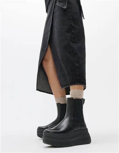 A modern ankle boot crafted from smooth leather with a contemporary platform sole. The clean silhouette combines versatility with supportive comfort for everyday wear.