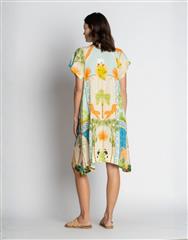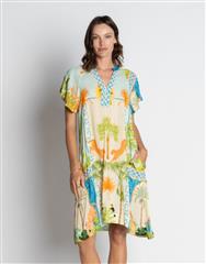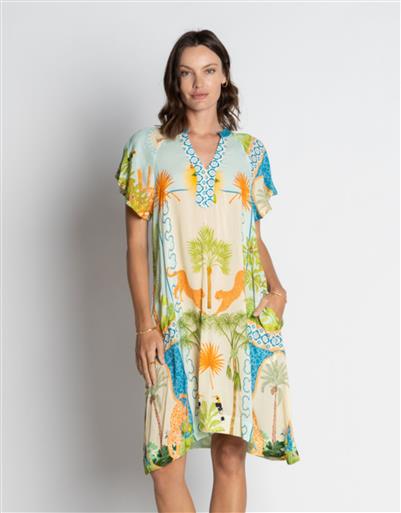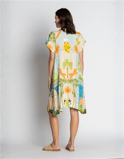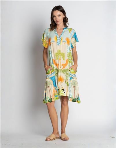 A vibrant tropical print dress featuring soft, breathable fabric and a relaxed, flowing fit. Perfect for warm days, holidays, and effortless summer style. 100% Viscose.