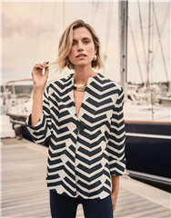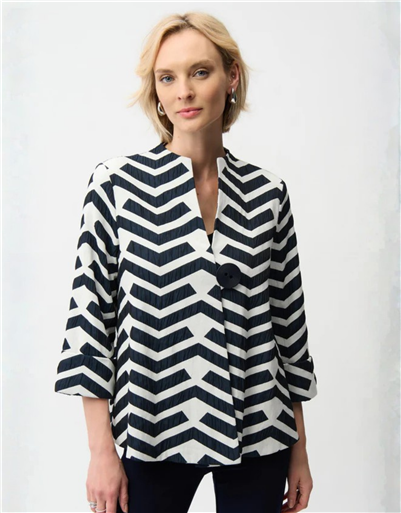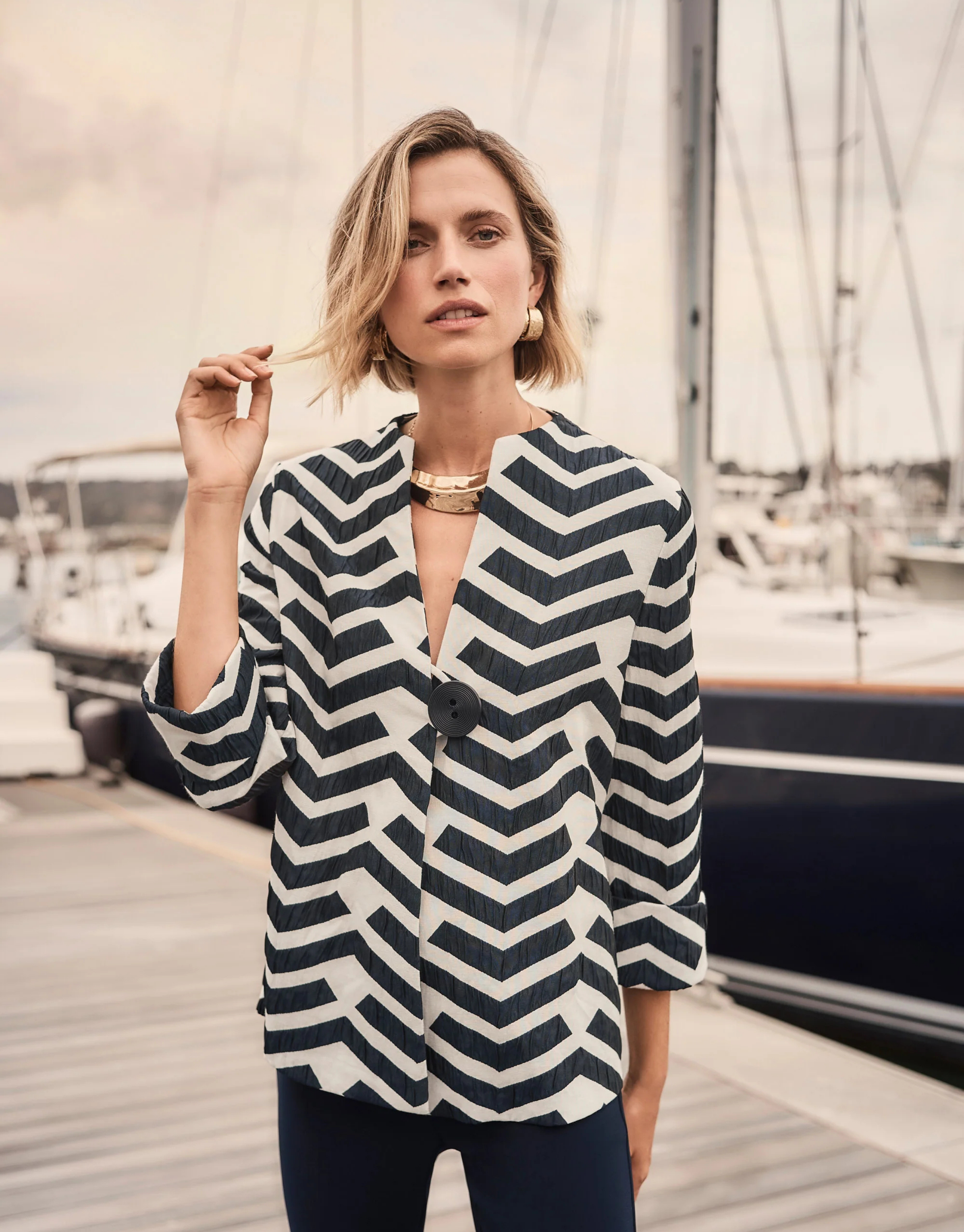 Crafted in a bold jacquard weave, this jacket offers dramatic geometry and a flattering trapeze silhouette. It features a crew neckline, three-quarter cuffed sleeves and statement buttons for added polish. The fabric composition blends 33% cotton, 65% polyester and 2% spandex for structure with comfort.