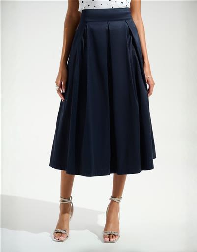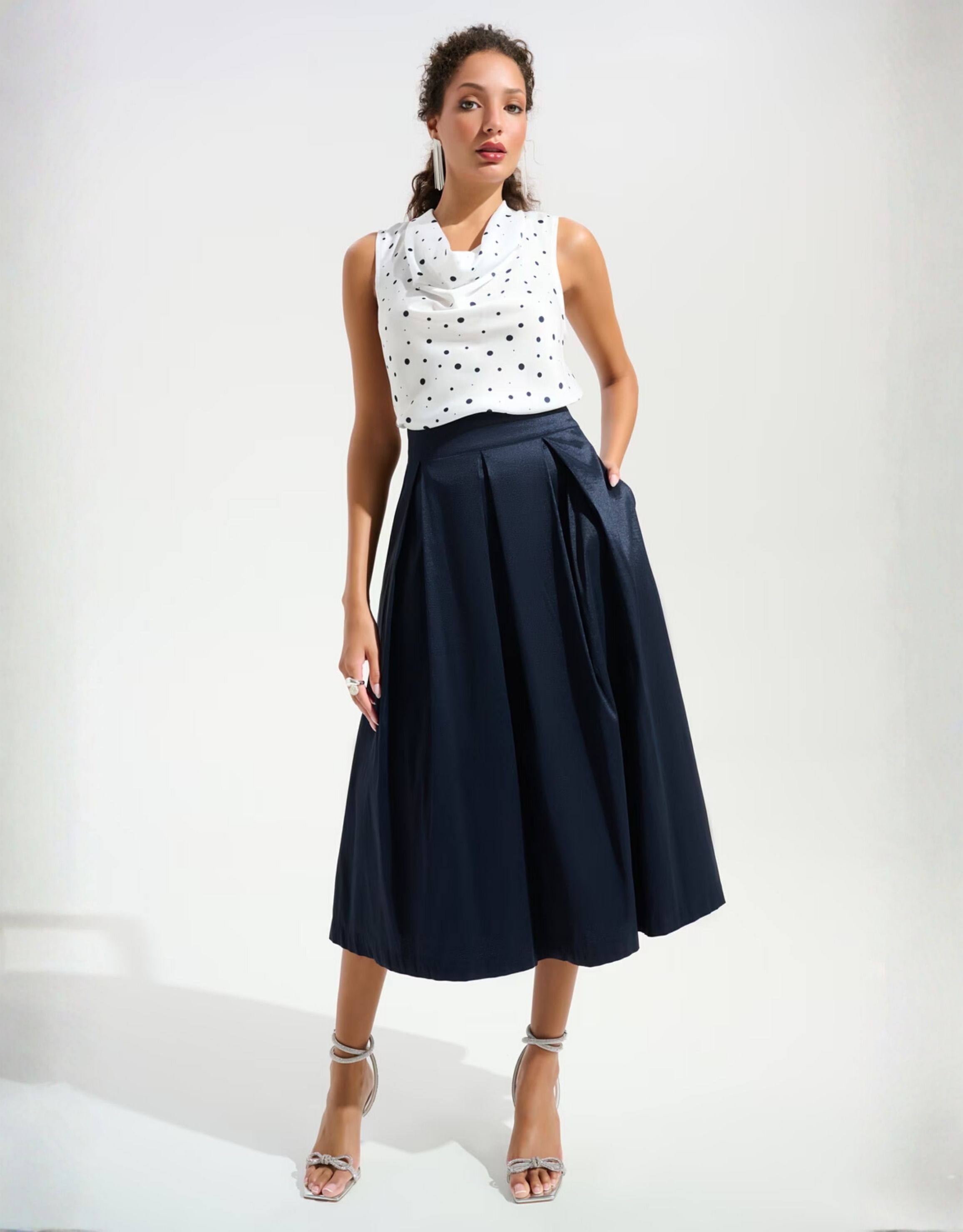 An elegant midi skirt from Joseph Ribkoff in lustrous stretch taffeta. Designed with soft box pleats for volume and movement, it sits smoothly at the waist with a wide waistband for a defined, flattering fit. Finished with a hidden side zipper and practical side pockets.