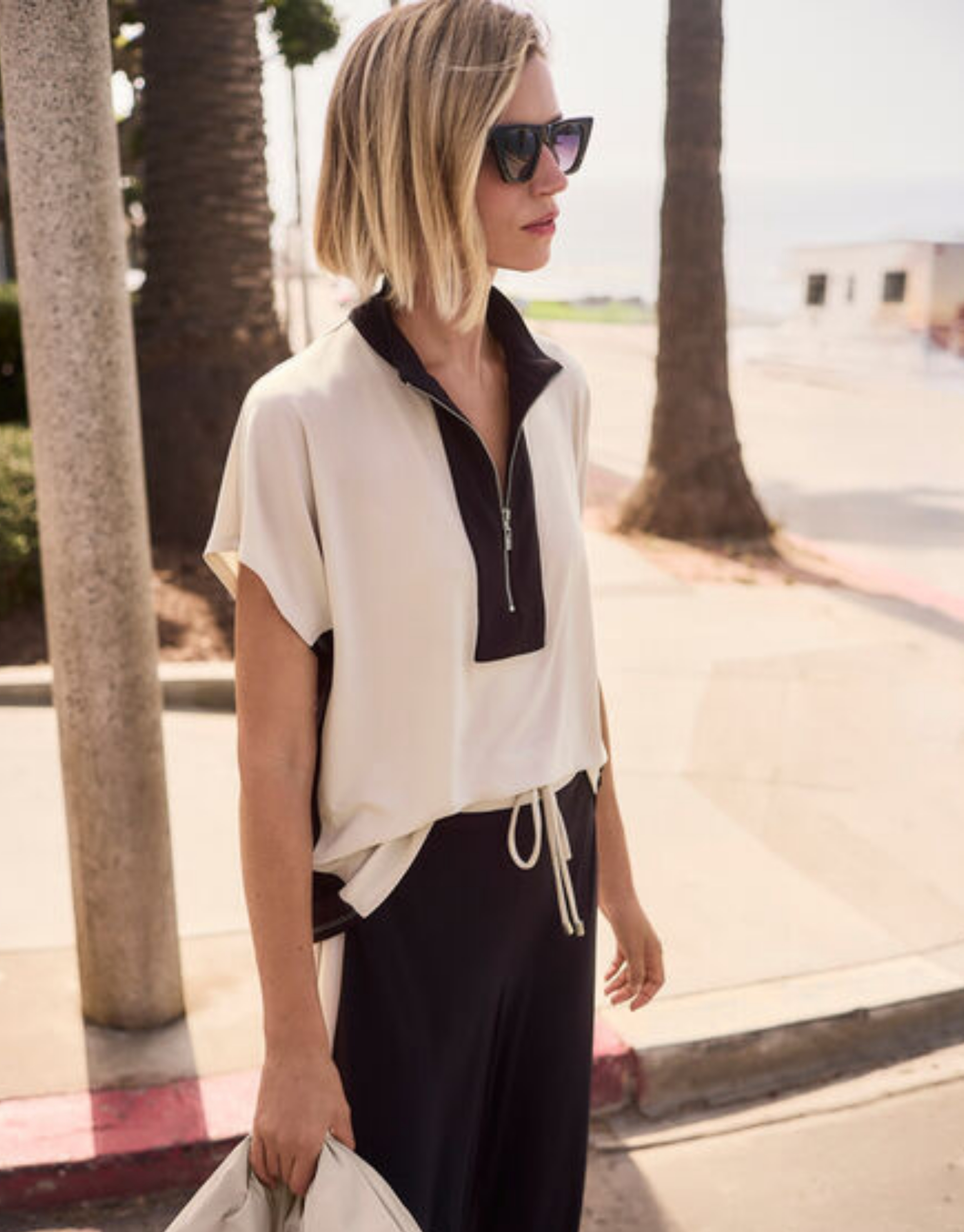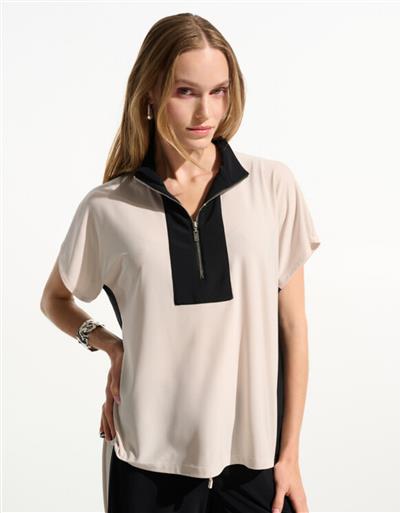 A clean, sporty polished top in silky knit with a zipped stand collar, dolman sleeves, and striking moonstone and black colour blocking.