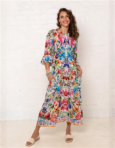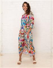 A flowing maxi dress with an all over floral print in pink and multicolour tones.