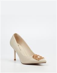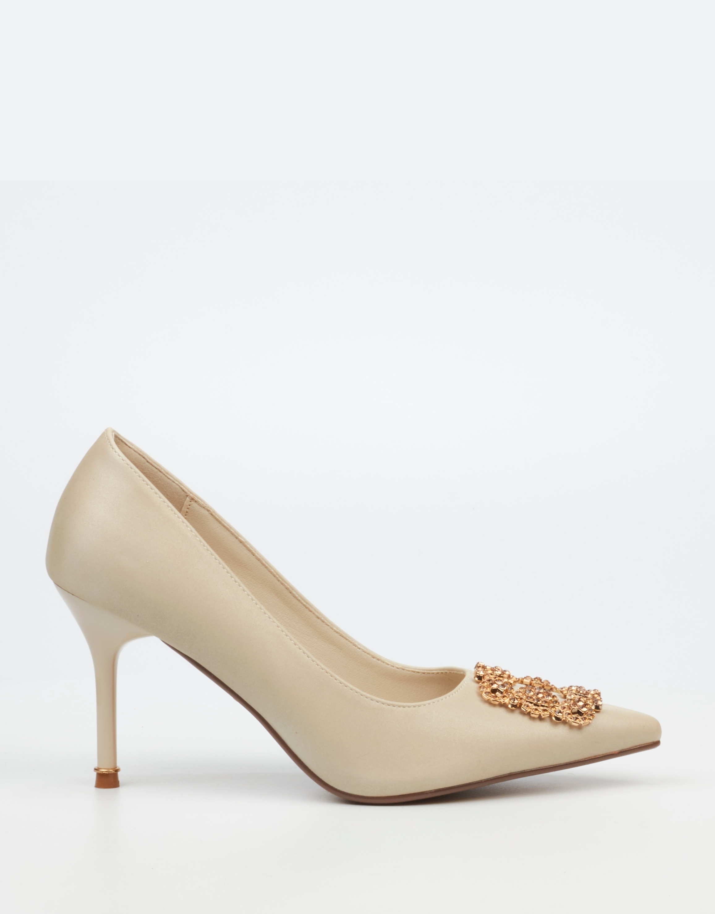 A refined and feminine heel in a soft champagne tone. Perfect for weddings, events, or special occasions, this court heel adds subtle glamour with its gold buckle accent and sleek shape.
