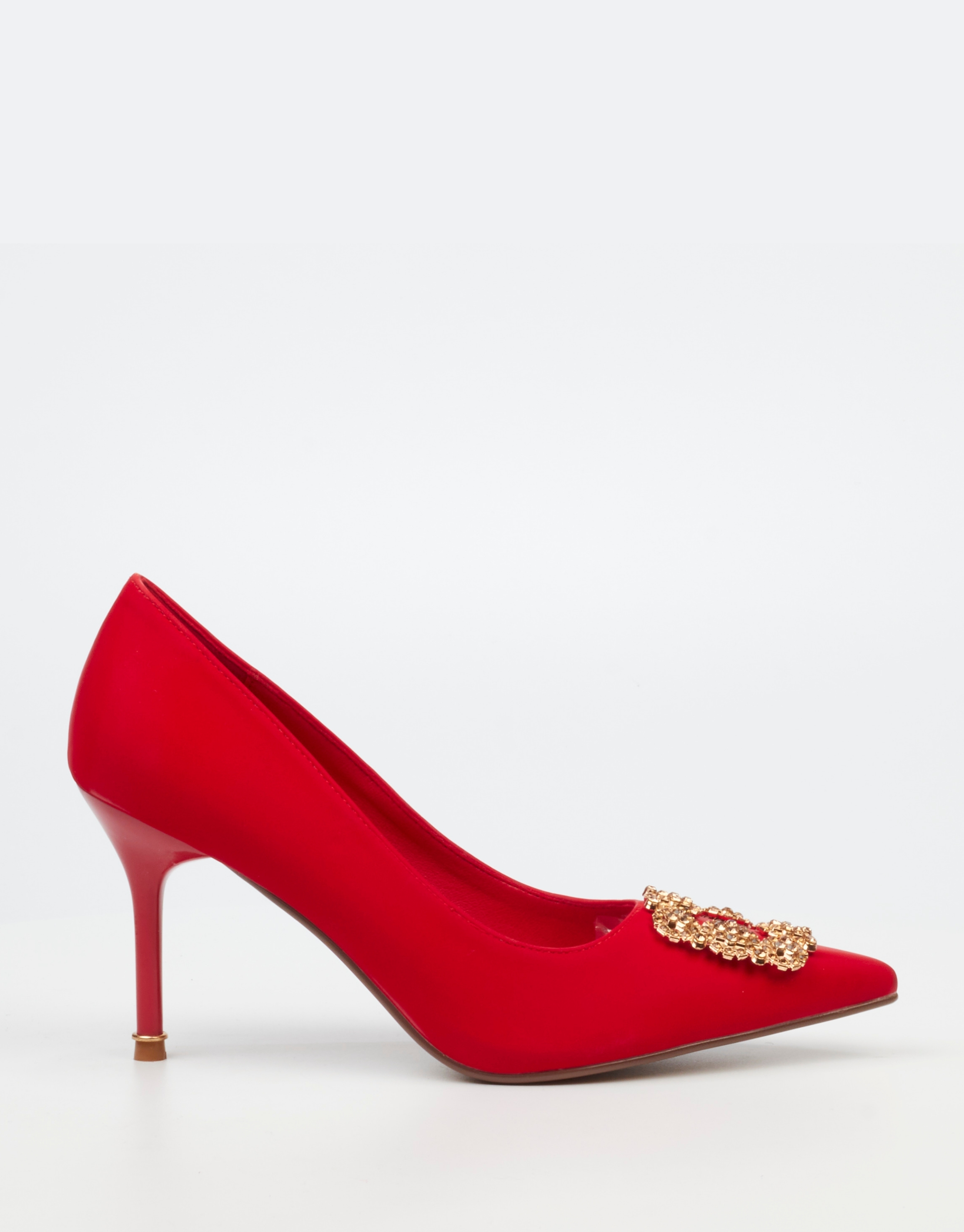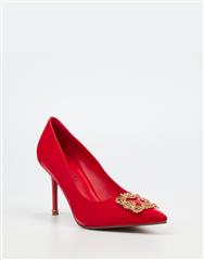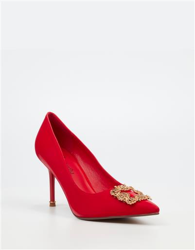 Make a bold statement with this striking red court heel. Designed with a sleek pointed toe and eye catching gold buckle detail, this style is perfect for nights out and standout looks.