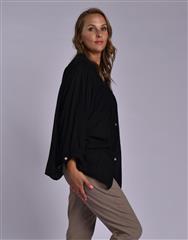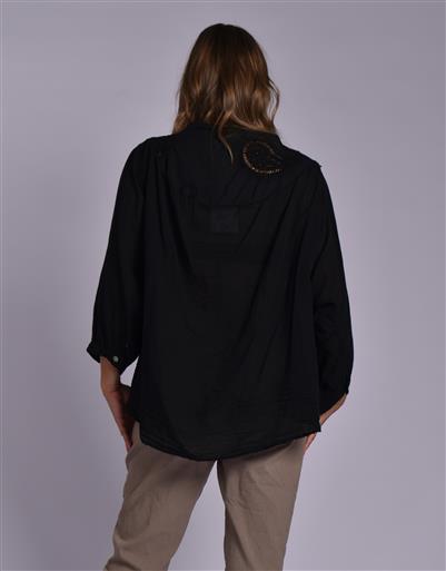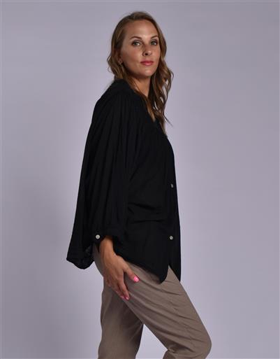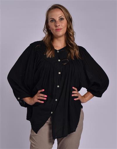 Crafted in Italy, this black statement blouse features a flowing shape with delicate texture and a refined, contemporary finish.