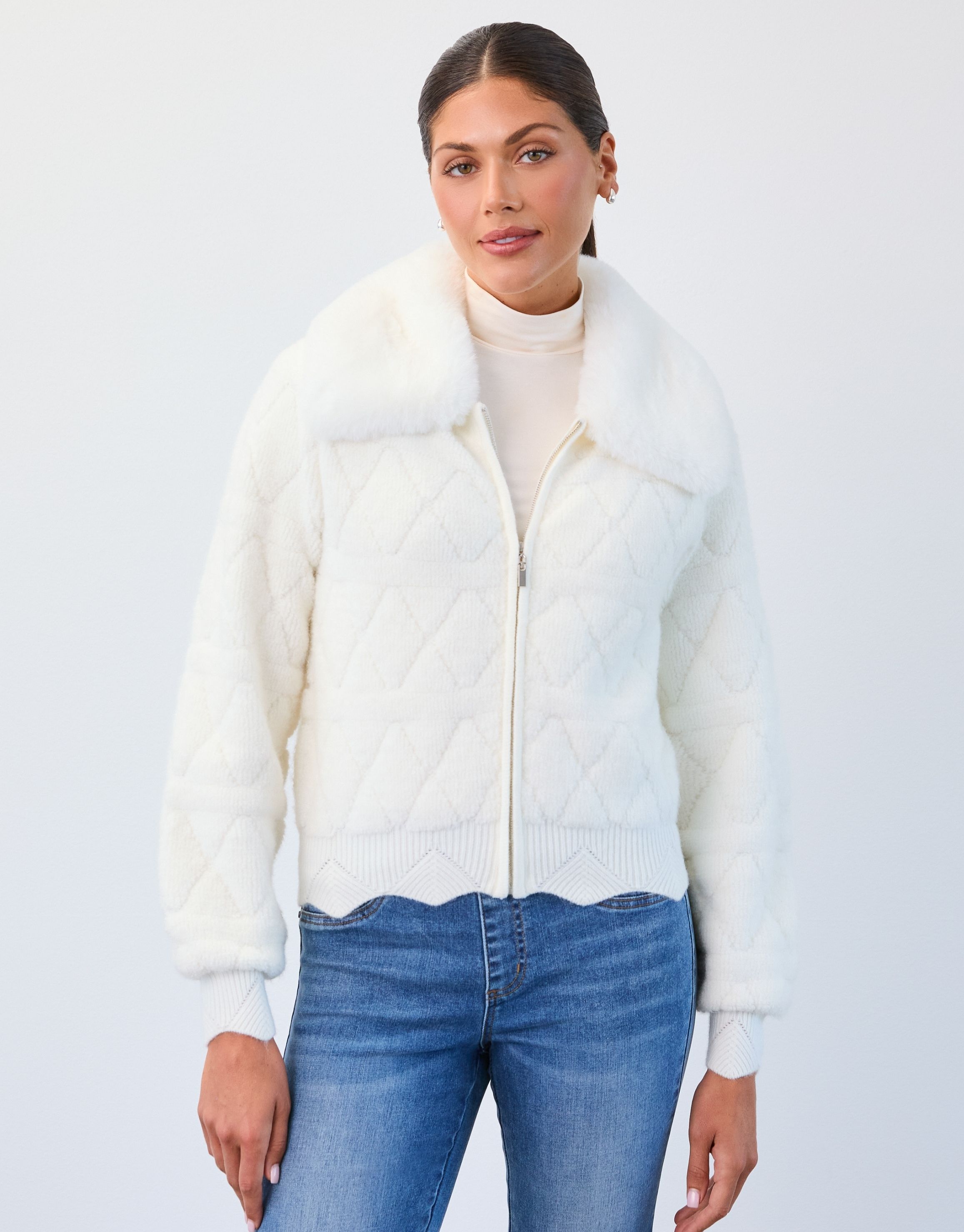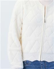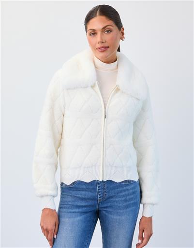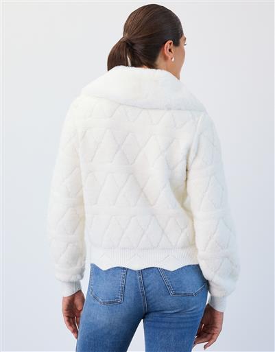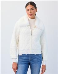 This cream quilted jacket brings soft texture and elevated detail to cool weather layering. Designed with a plush collar and subtle quilt pattern throughout, it features a zip front closure and ribbed trim at the hem and cuffs. The cropped silhouette makes it ideal for pairing with denim or tailored pants.