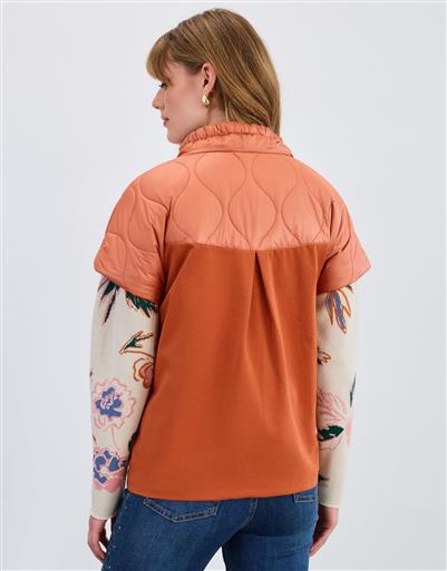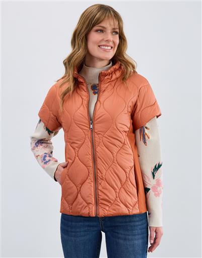 Layer in style with this lightweight quilted vest. Designed in a warm bronzy tone, it features a zip front closure and subtle wave quilting. The short sleeves and stand collar add contemporary appeal, making it a versatile layering piece.