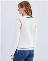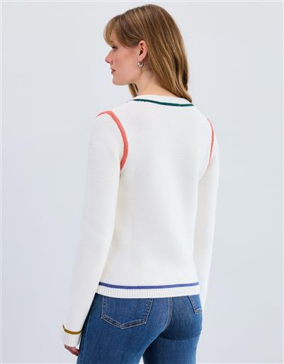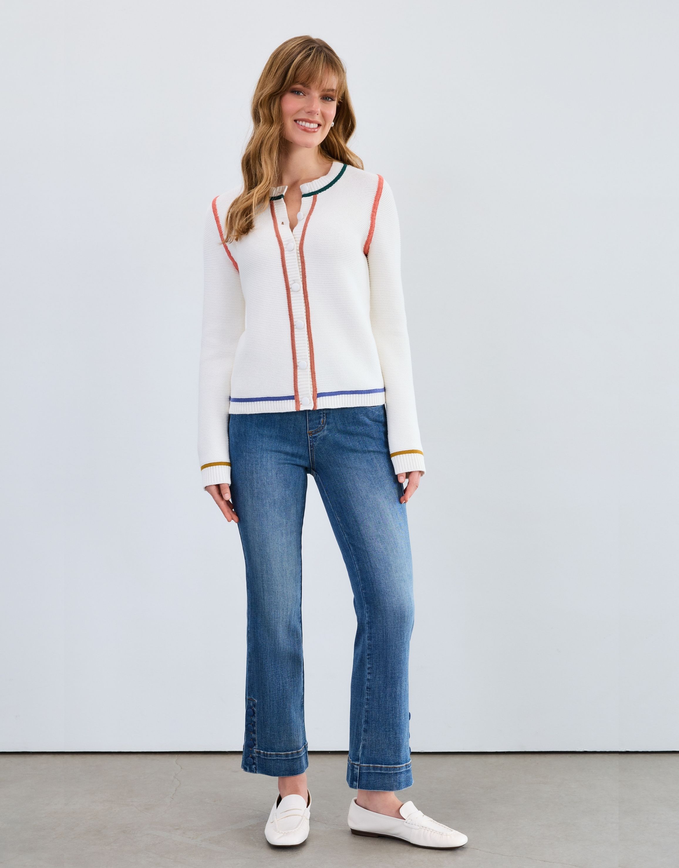 A refined layering essential, this knit cardigan features contrast trim detailing for a modern finish. Designed with a round neckline and button front closure, it offers a flattering fitted shape that pairs effortlessly with denim or tailored pants.