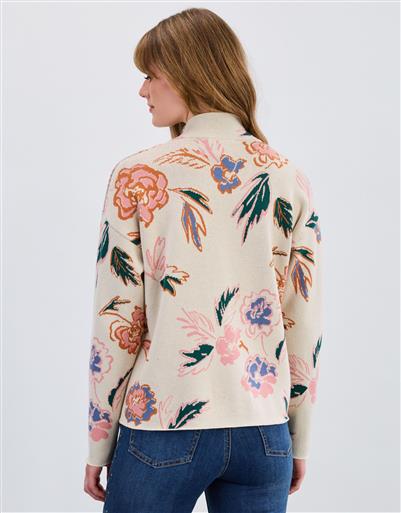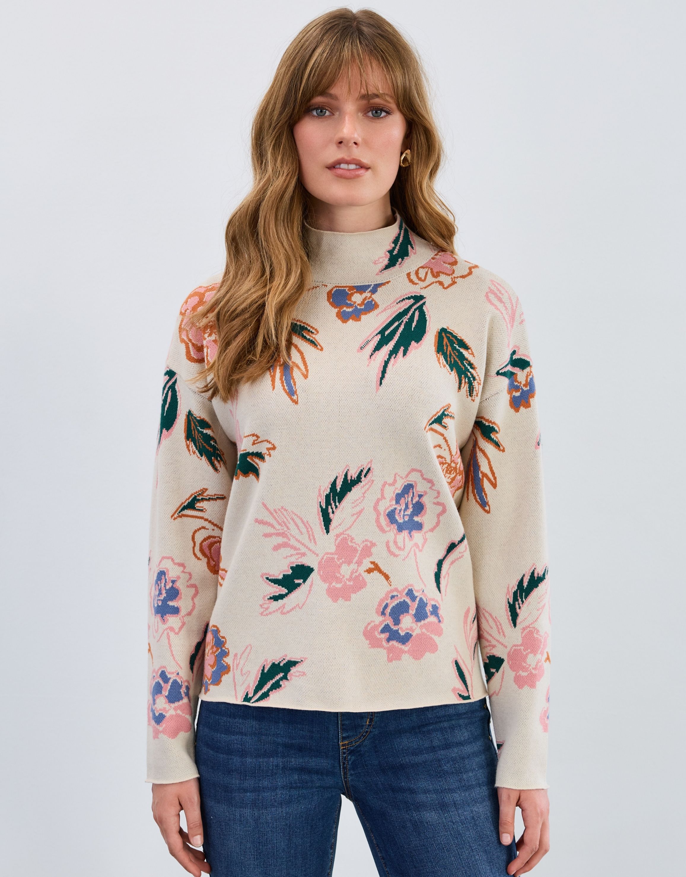 Refresh your knitwear collection with this soft floral mock neck sweater. Designed in a neutral beige base with a bold multi colour floral pattern, this sweater blends comfort with statement style. The relaxed silhouette and long sleeves make it ideal for layering, while the mock neckline adds a polished finish. Perfect for pairing with denim for effortless everyday wear.