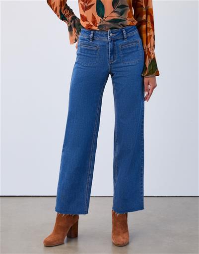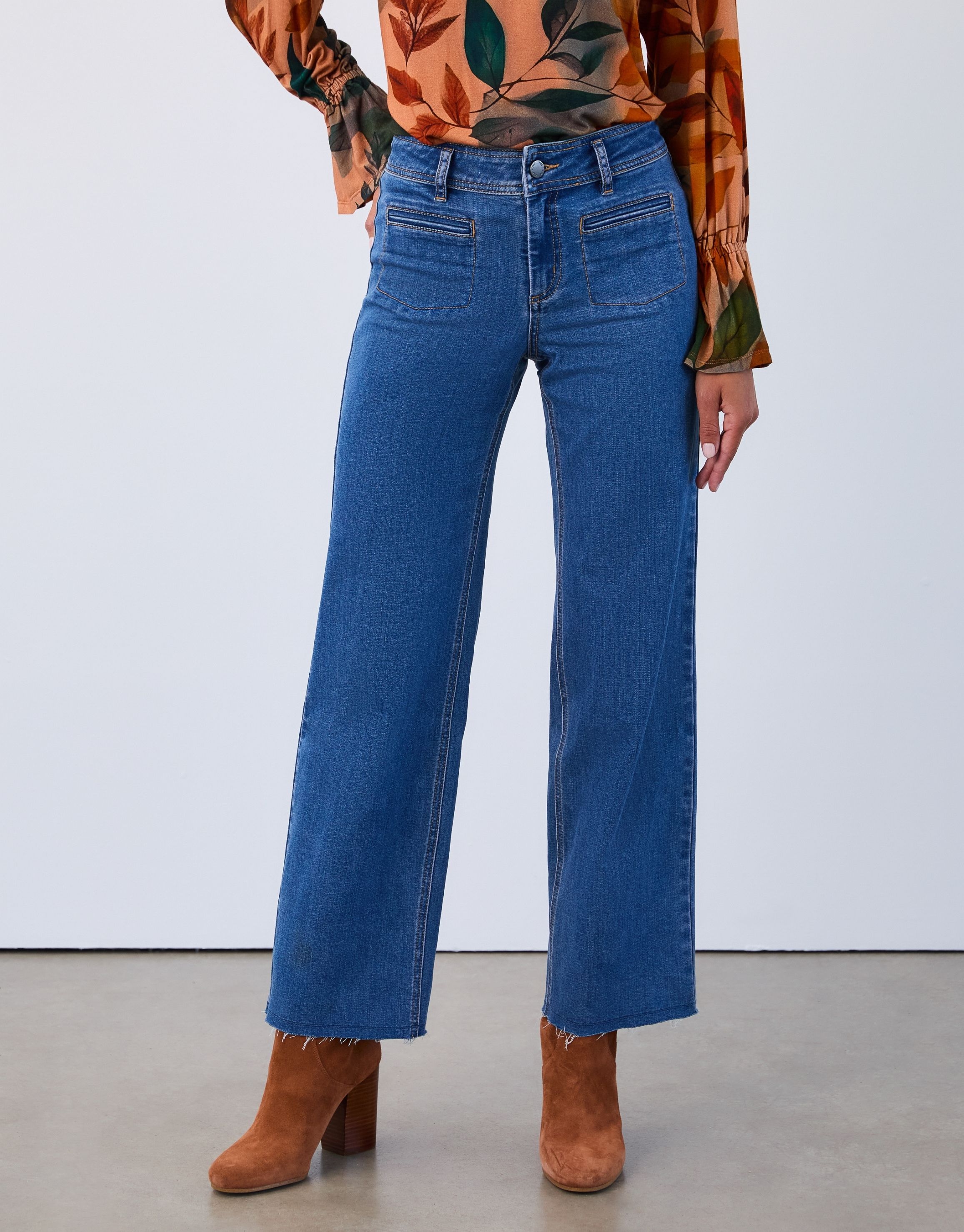 This dark wash straight leg jean offers timeless appeal. Designed with a classic five pocket construction and clean finish, it provides a flattering shape that transitions seamlessly from day to night.