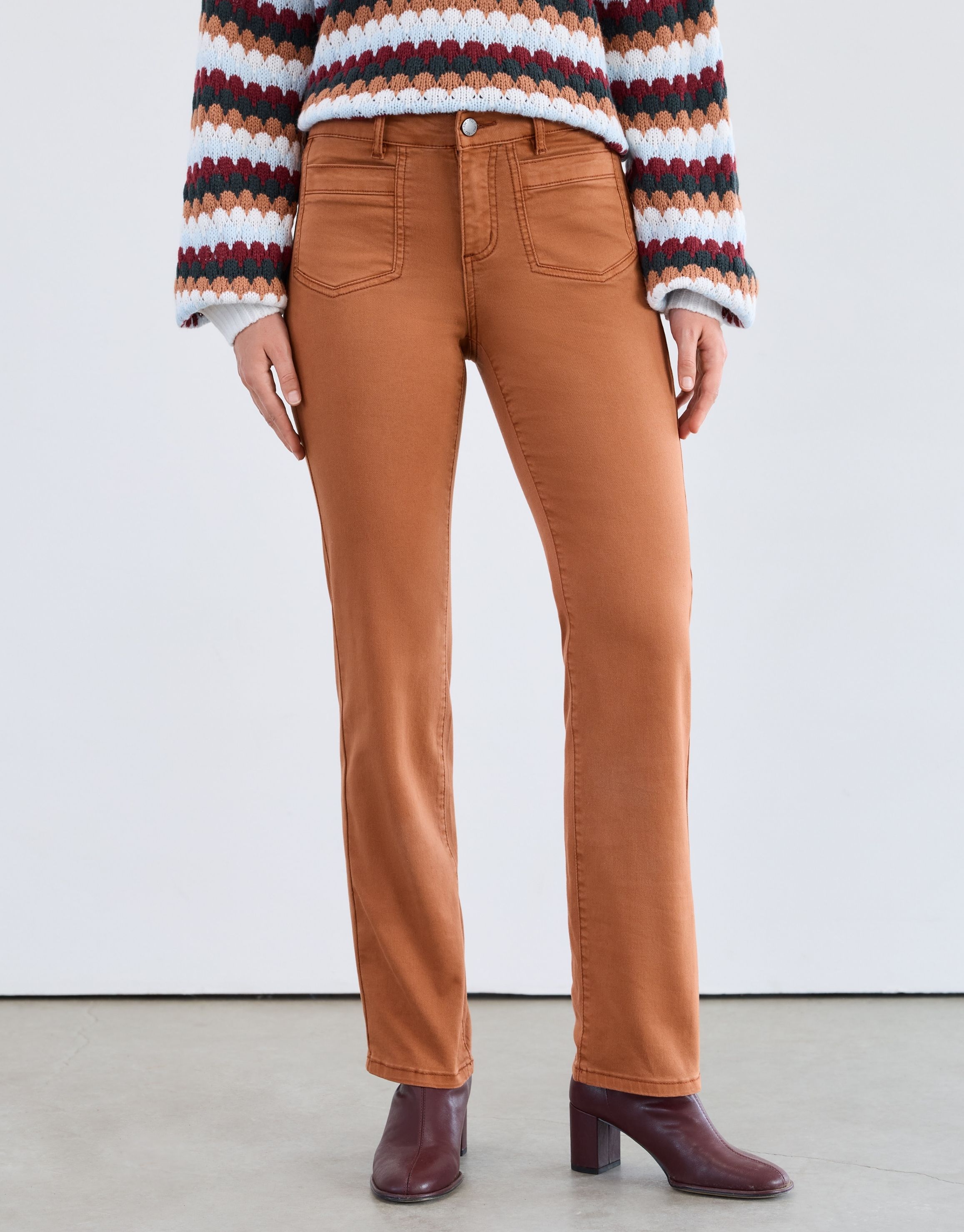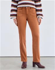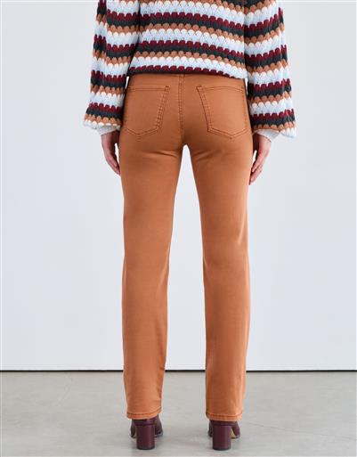 Elevate your look with this bronze tone straight leg pant. Featuring a classic silhouette and flattering mid rise fit, this style offers versatility for both casual and dressier occasions.