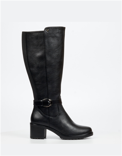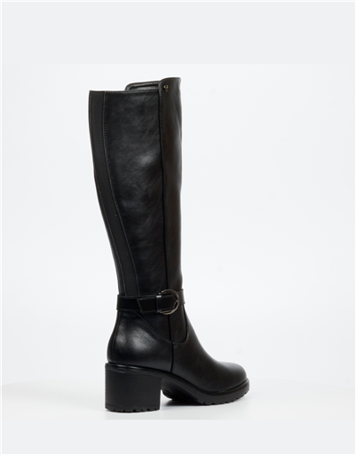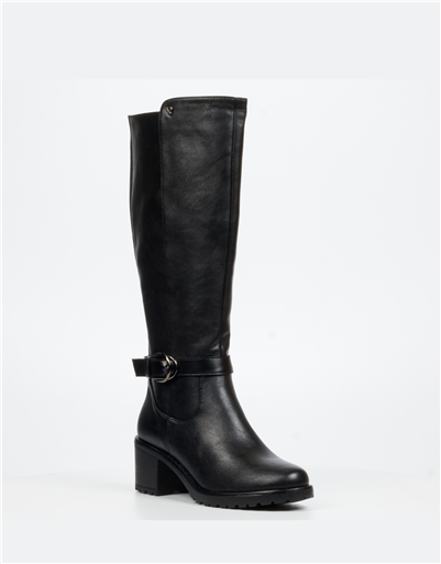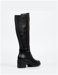 A refined black leather knee high boot designed for effortless seasonal styling. The clean silhouette is complemented by a decorative ankle strap and buckle detail, adding subtle character to a classic shape. A supportive block heel ensures comfort and stability, making it ideal for all day wear while maintaining a polished finish.