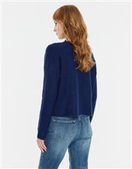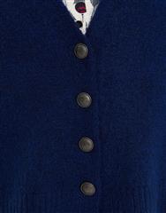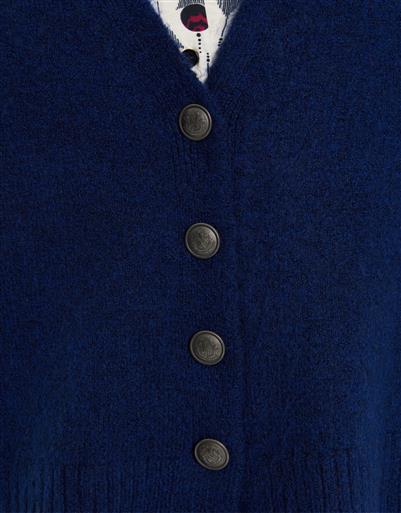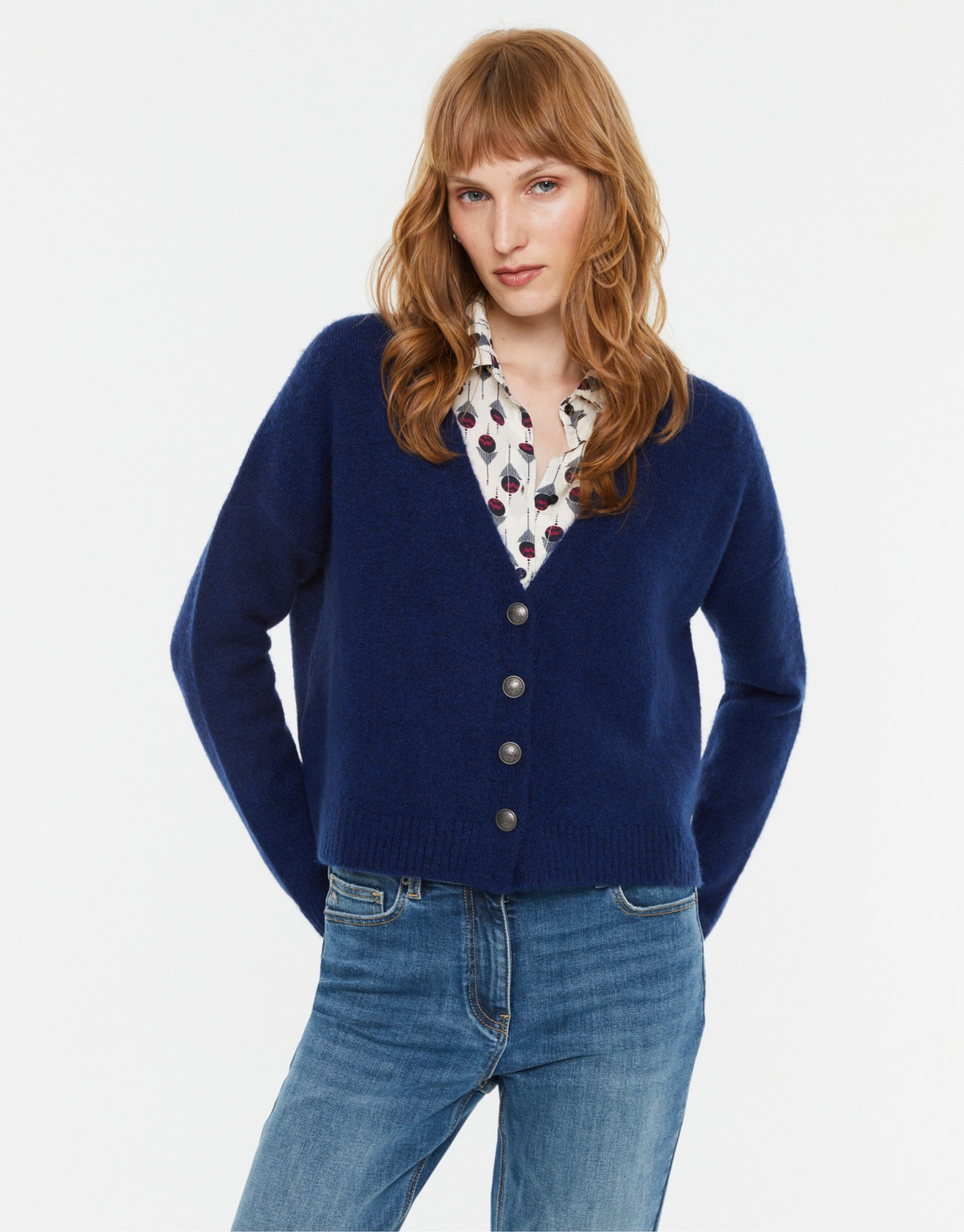 A refined cardigan in a rich blue tone, finished with front button detailing. The soft knit texture and slightly cropped silhouette create a flattering proportion, perfect for layering over blouses or wearing as a standalone knit.