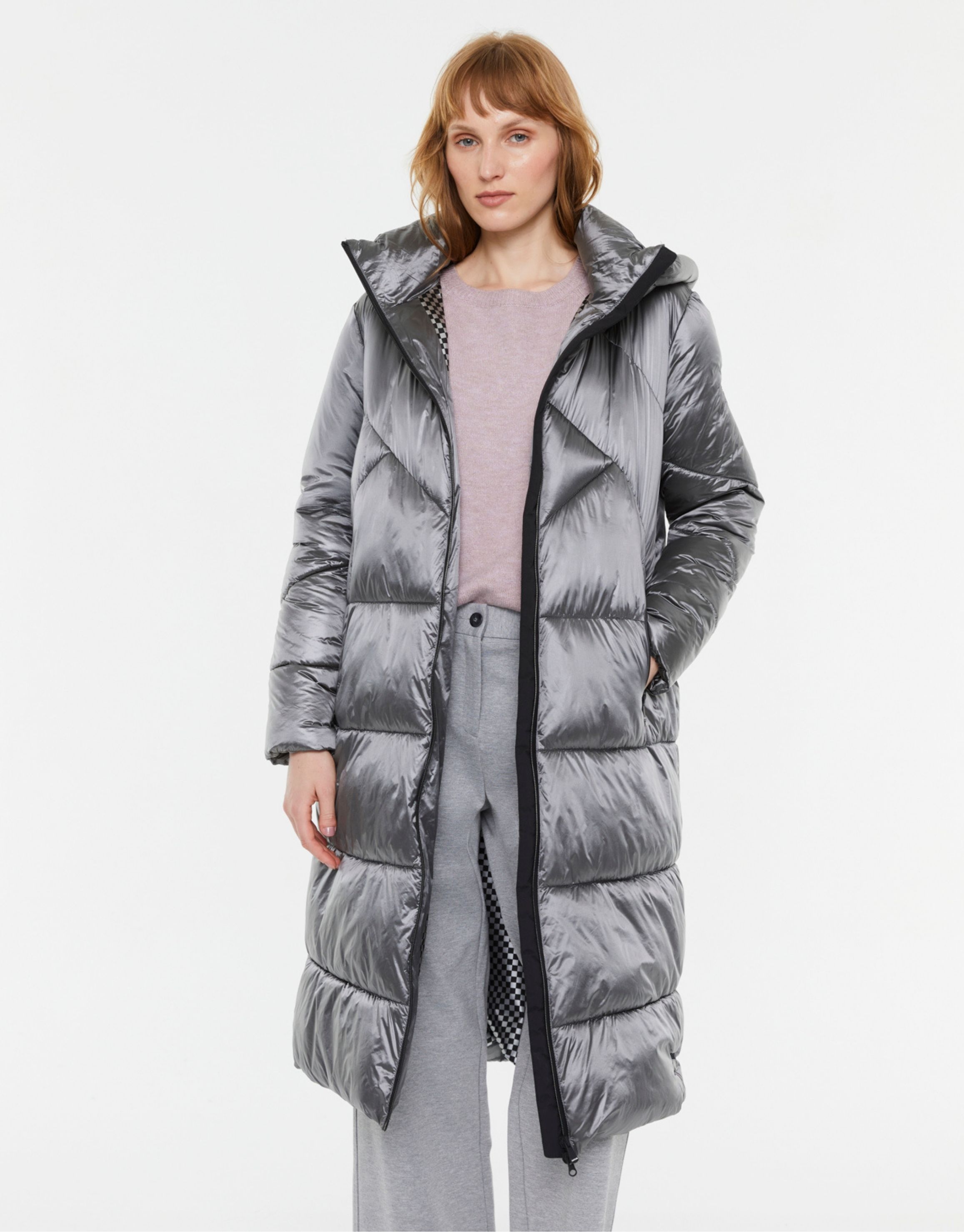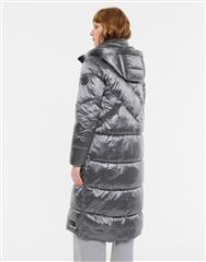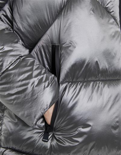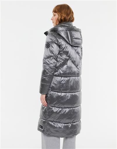 A longline quilted coat in a metallic silver finish. Designed with a high collar, front zip closure and padded construction for warmth and impact. The elongated silhouette adds drama while maintaining a clean, contemporary aesthetic.