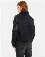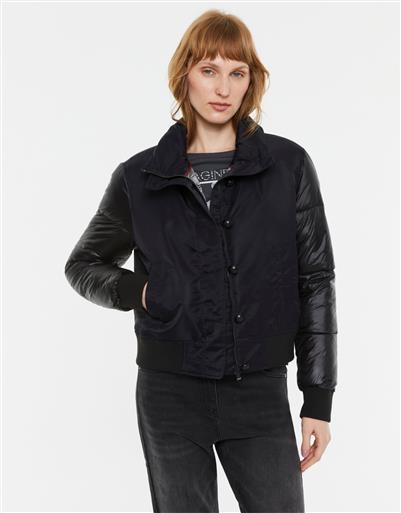 A contemporary bomber inspired parka crafted for urban versatility. Designed in a deep black tone, it features a boxy silhouette with quilted sleeve detailing that adds subtle contrast and textural interest. The zip and button closure at the front offers practical warmth, while the clean lines keep the look modern and curated. Layer over knits, tees or elevated basics for a refined weekend or city wardrobe staple.