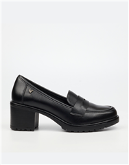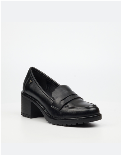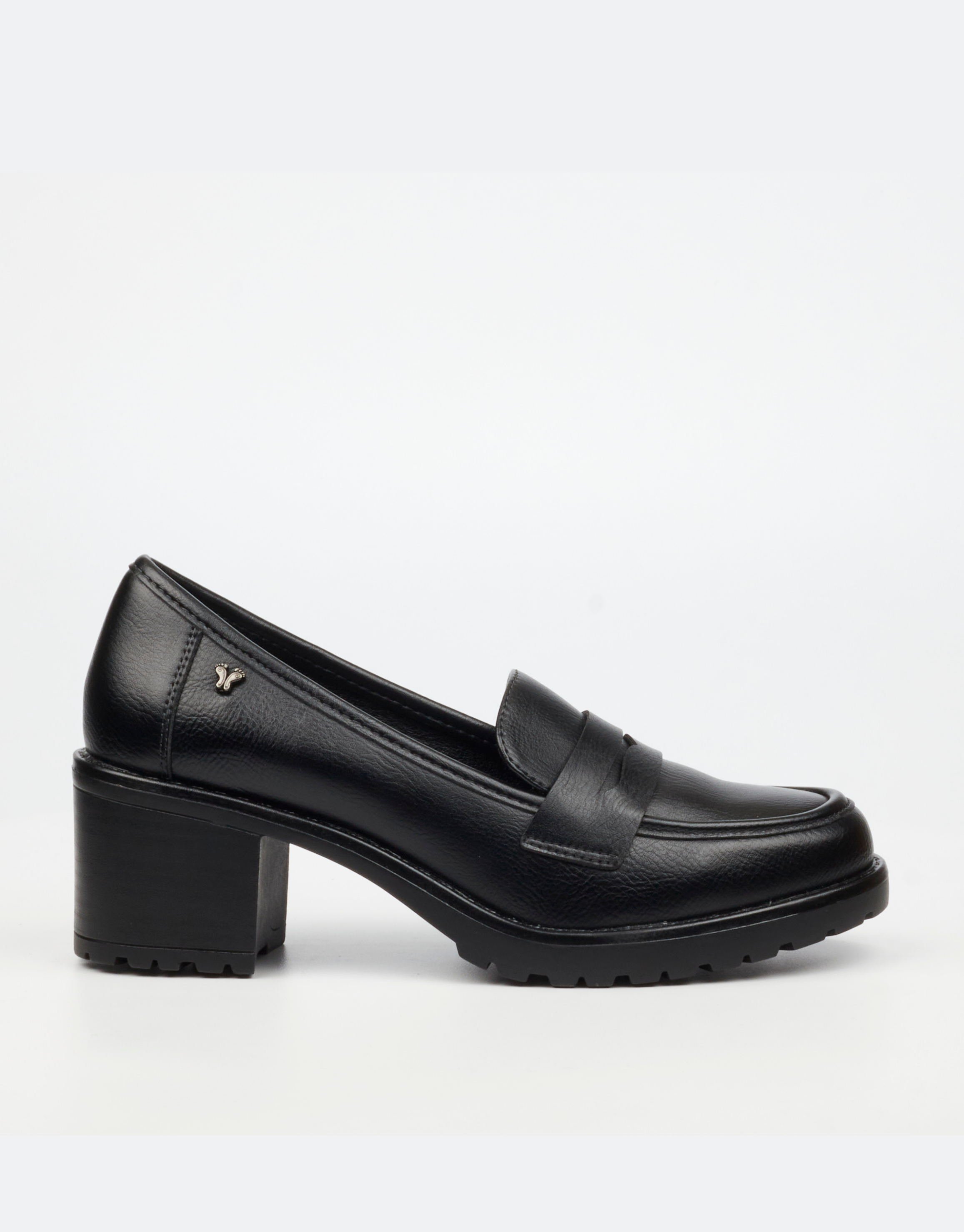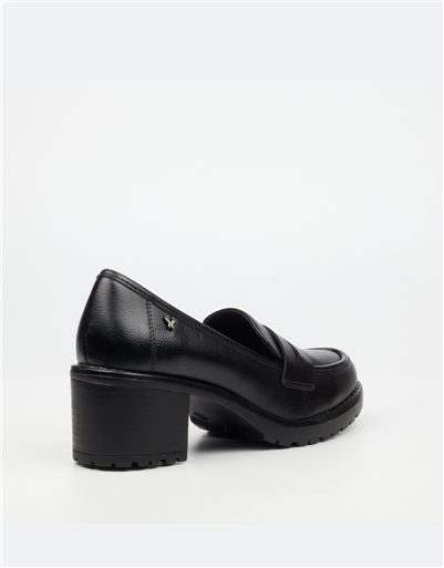 Sleek and endlessly versatile, this black leather block heel loafer is a wardrobe essential. Featuring a traditional loafer upper and supportive block heel, it offers elevated comfort without sacrificing style. The lug sole adds modern durability, making it perfect for workdays or everyday wear.
