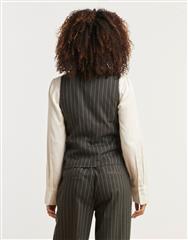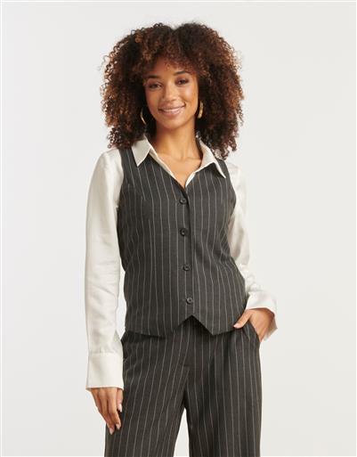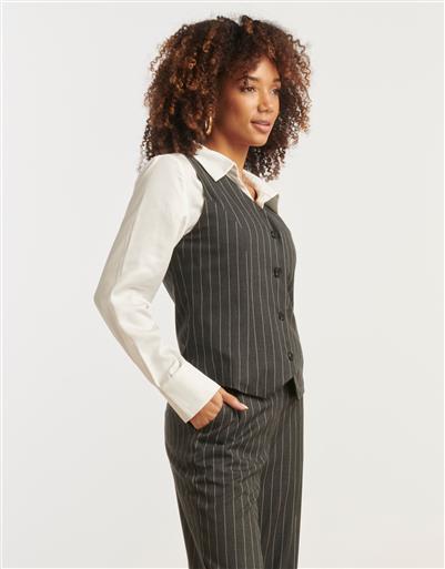 A fitted grey pinstripe waistcoat with button front detail. Ideal for layering over a blouse or wearing with matching trousers.