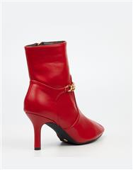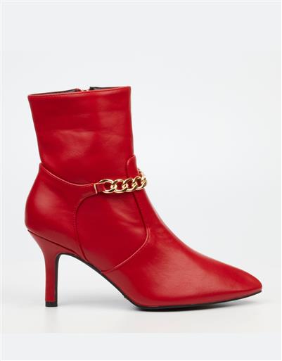 Make a bold statement in the Lively 13 Red. This striking leather ankle boot features a pointed toe, elegant stiletto heel, and signature gold chain detail for standout sophistication.