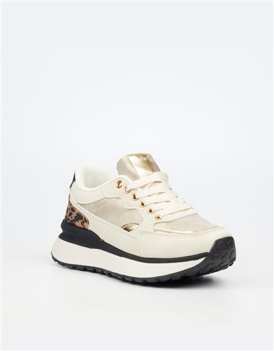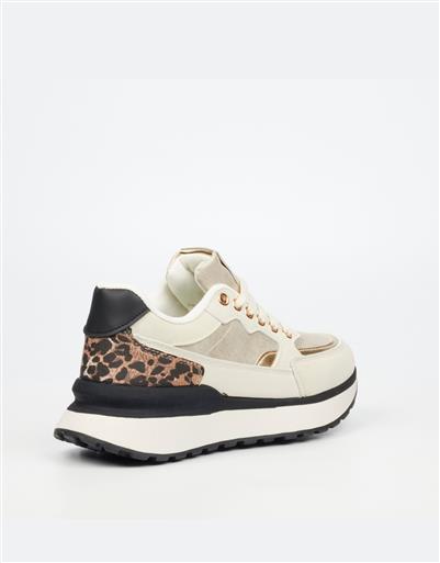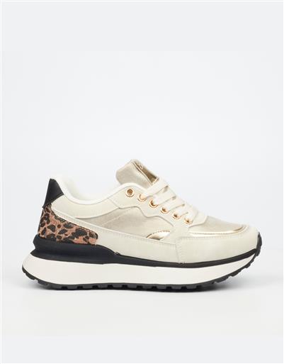 A contemporary sneaker in a soft beige finish with metallic accents and leopard print heel detail. Designed with a lace up front, cushioned interior, and a chunky platform sole for comfortable everyday wear with a modern edge.