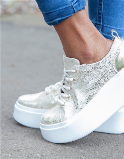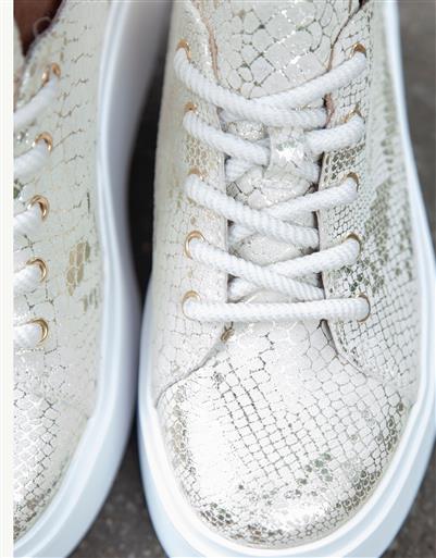 Radiating refined luxury, this gold snake effect leather sneaker offers elevated design with dependable comfort. The platform sole provides subtle height, while the lace up fastening ensures a secure and balanced fit.