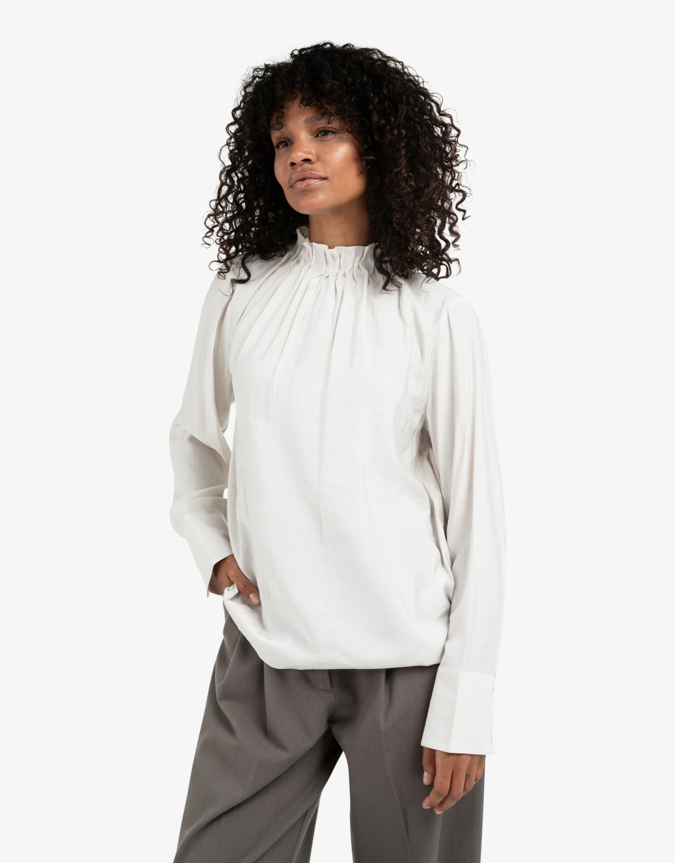 A refined long sleeve top crafted from soft fabric with a clean modern silhouette. Designed with subtle detailing that enhances the understated elegance of the piece.