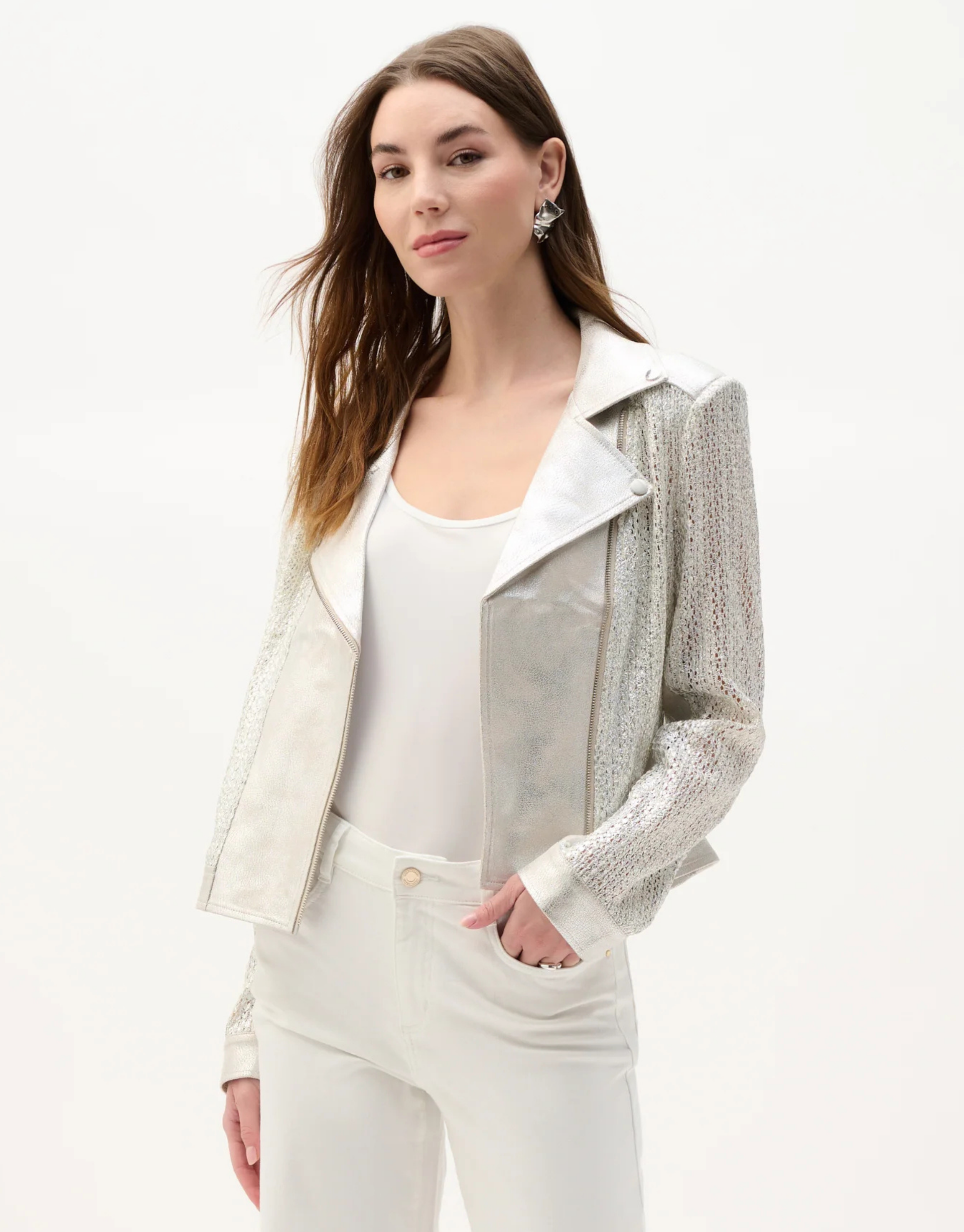 Foiled faux suede meets open-stitch knit in this fitted moto jacket, blending edge with texture. Designed with a notched collar and metal snaps, it features zipper closure with signature JR pullers and cuff detailing for a polished finish.