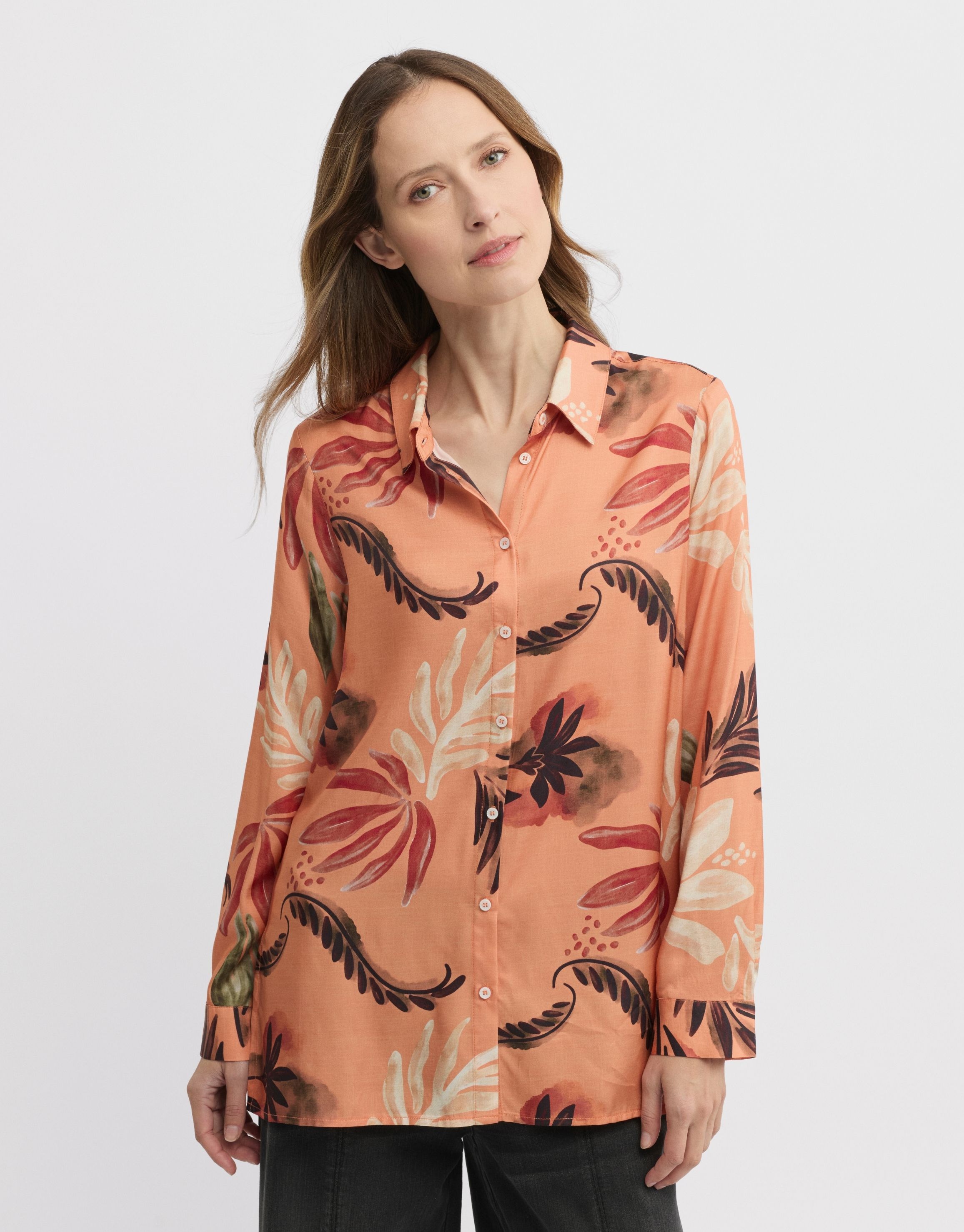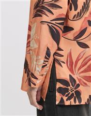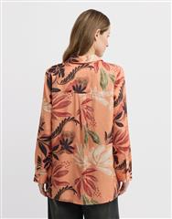 Button-up shirt with an Autumnal print and elegant slits on the side.