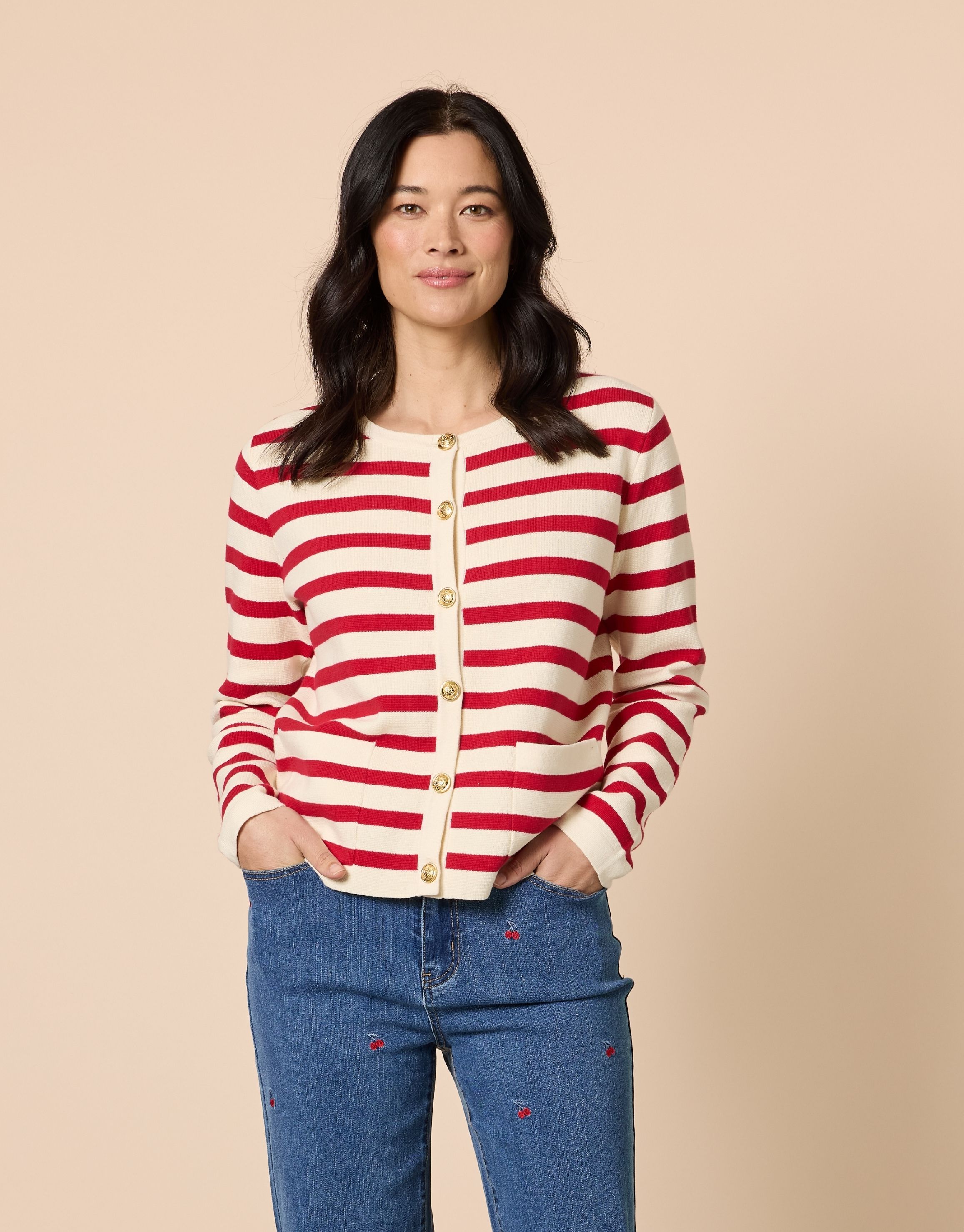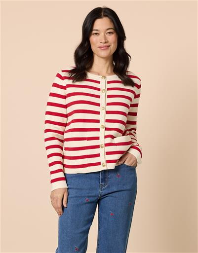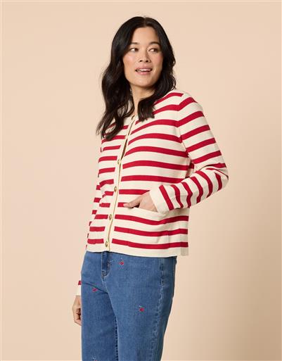 Knitted cardigan designed with a classic horisontal stripe pattern and refined button detailing. The structured silhouette and soft handle make it an effortless layering piece.