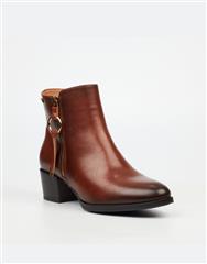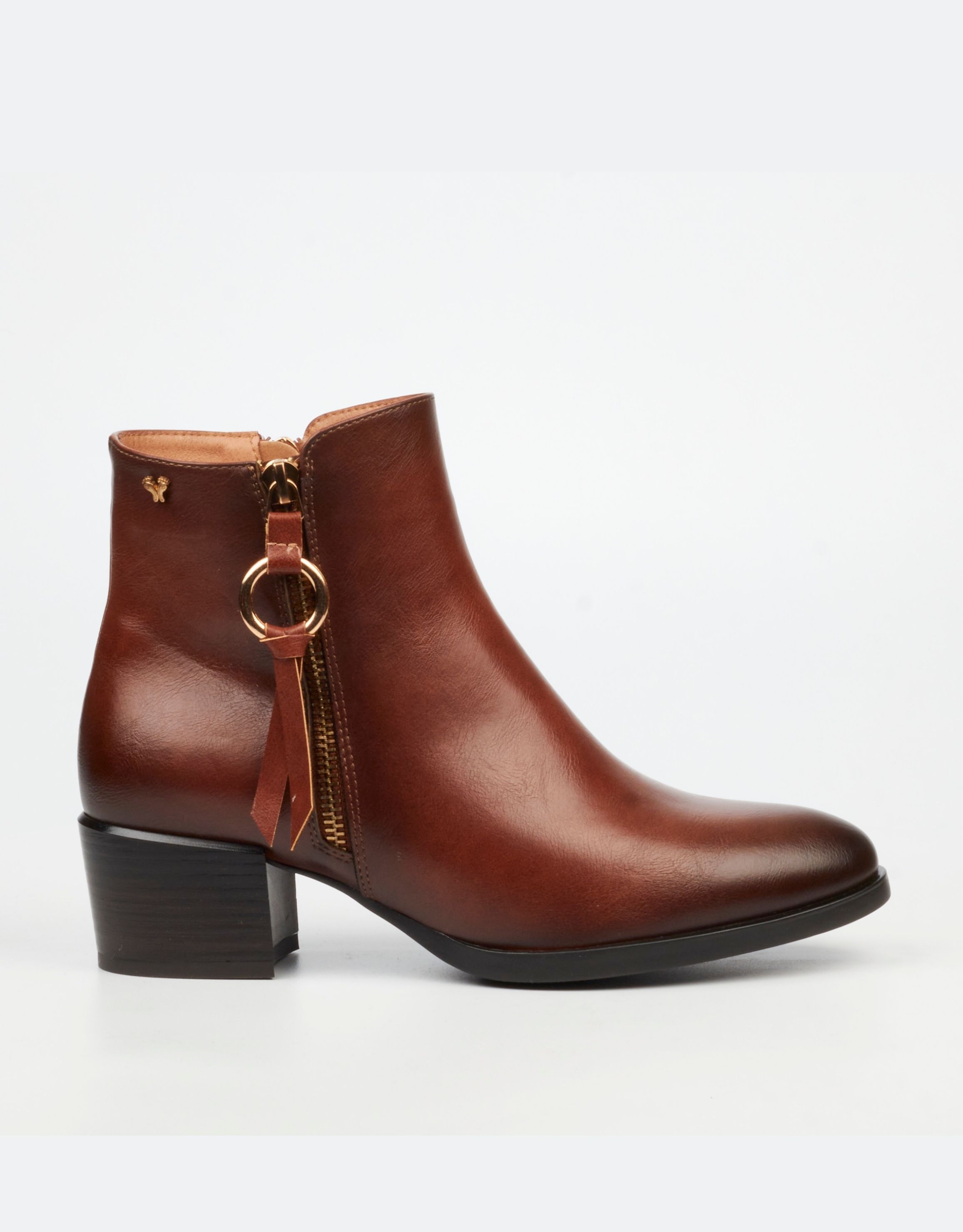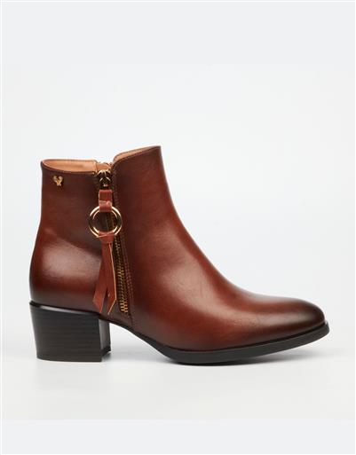 A classic ankle boot crafted with a smooth finish and warm tonal richness. The clean silhouette is elevated by a metallic zip detail, offering understated elegance with practical wearability.