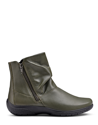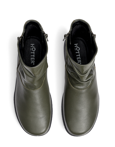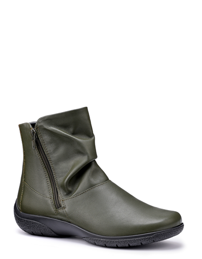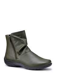A modern ankle boot crafted with a rich green tone and relaxed silhouette. The side zip design allows for easy wear, complemented by a supportive and durable sole.