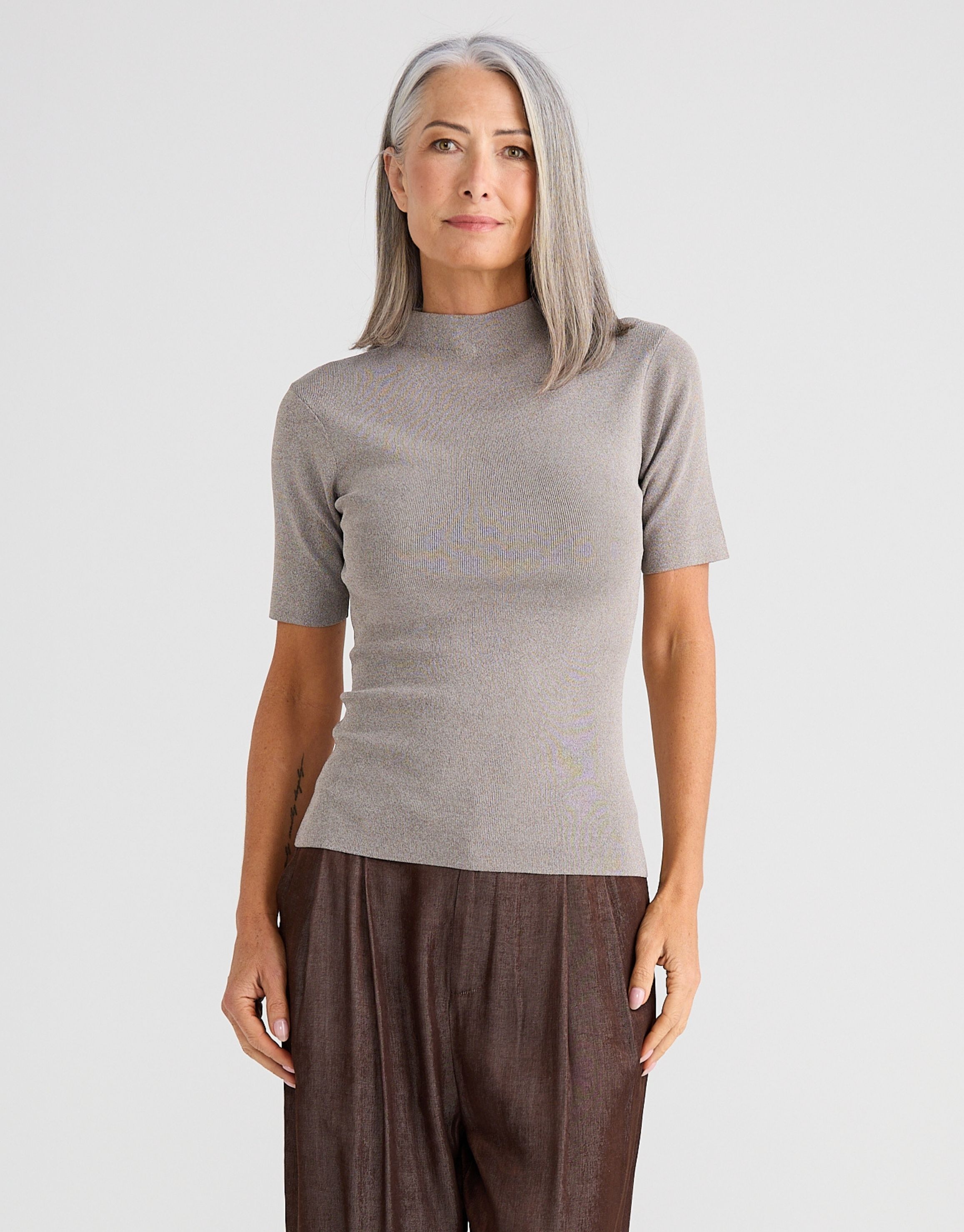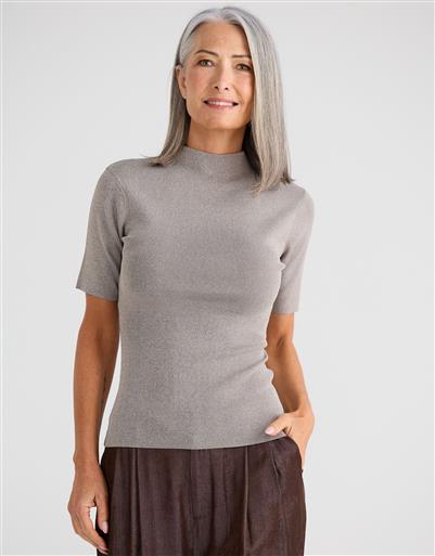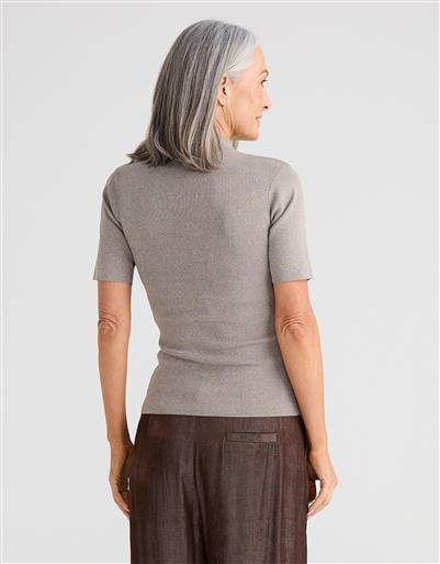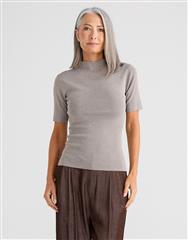 A modern short sleeve knit with a clean, minimal silhouette, ideal for layering. This top offers a polished and understated aesthetic look.