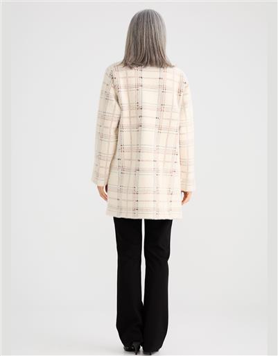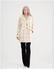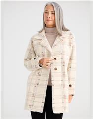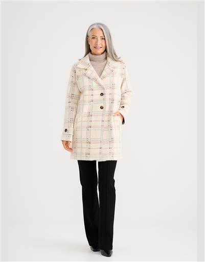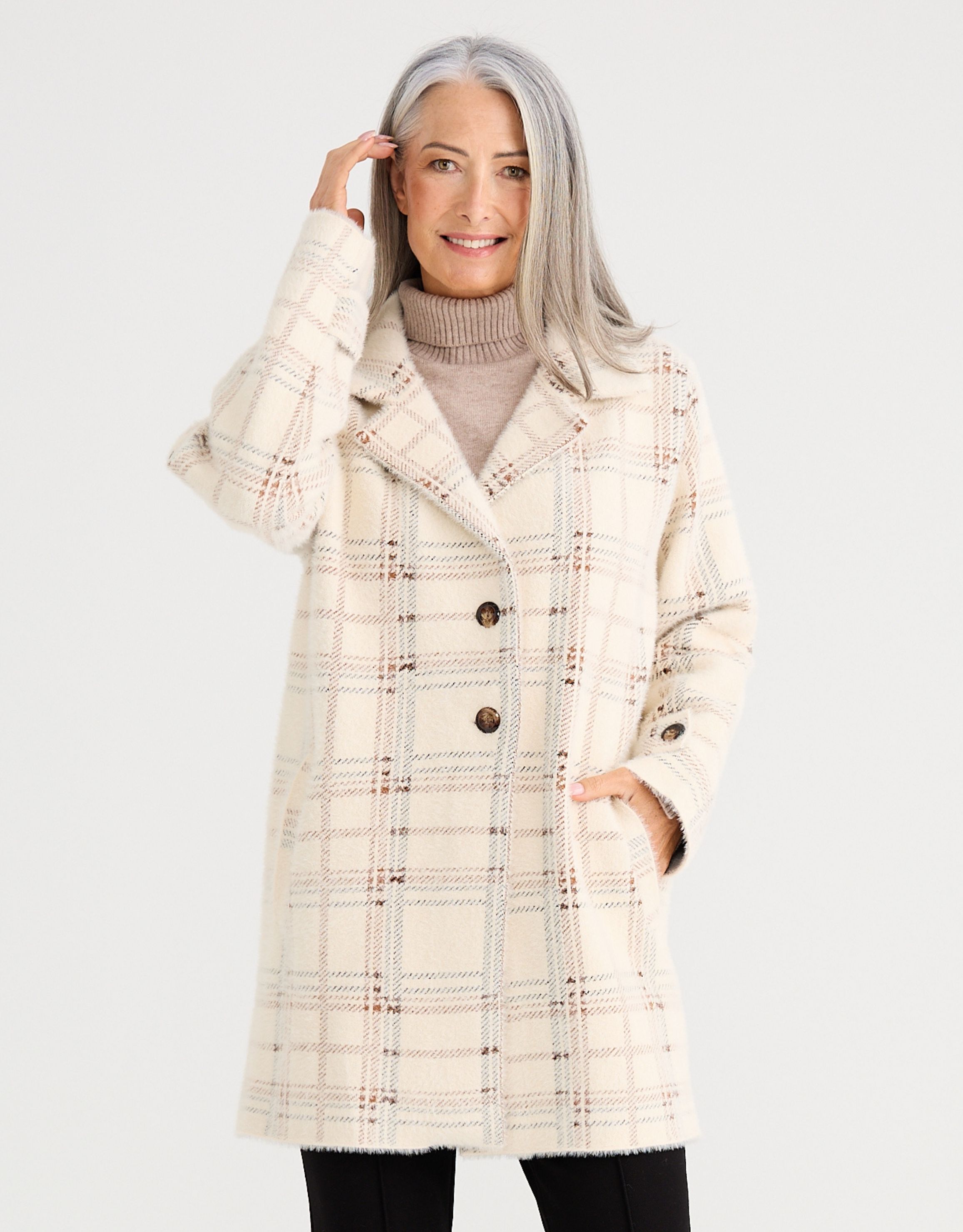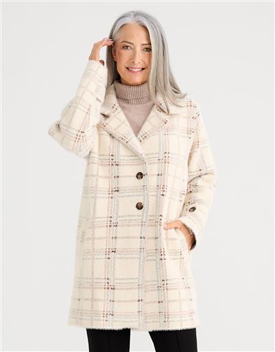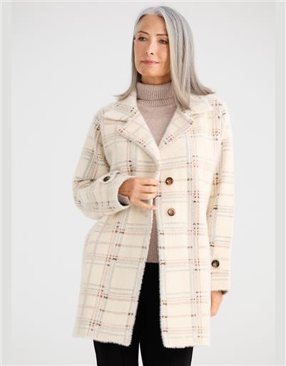 A bold check coat with a soft, cosy feel, blending structure with relaxed sophistication.