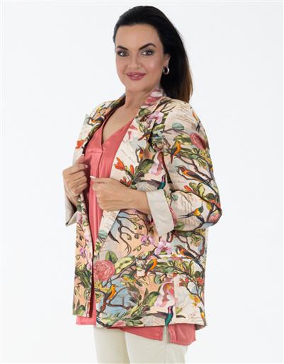 A tailored blazer featuring a vibrant nature-inspired print for a distinctive finish. The structured shape enhances the overall silhouette while remaining comfortable to wear. This piece offers a polished statement with a refined edge.