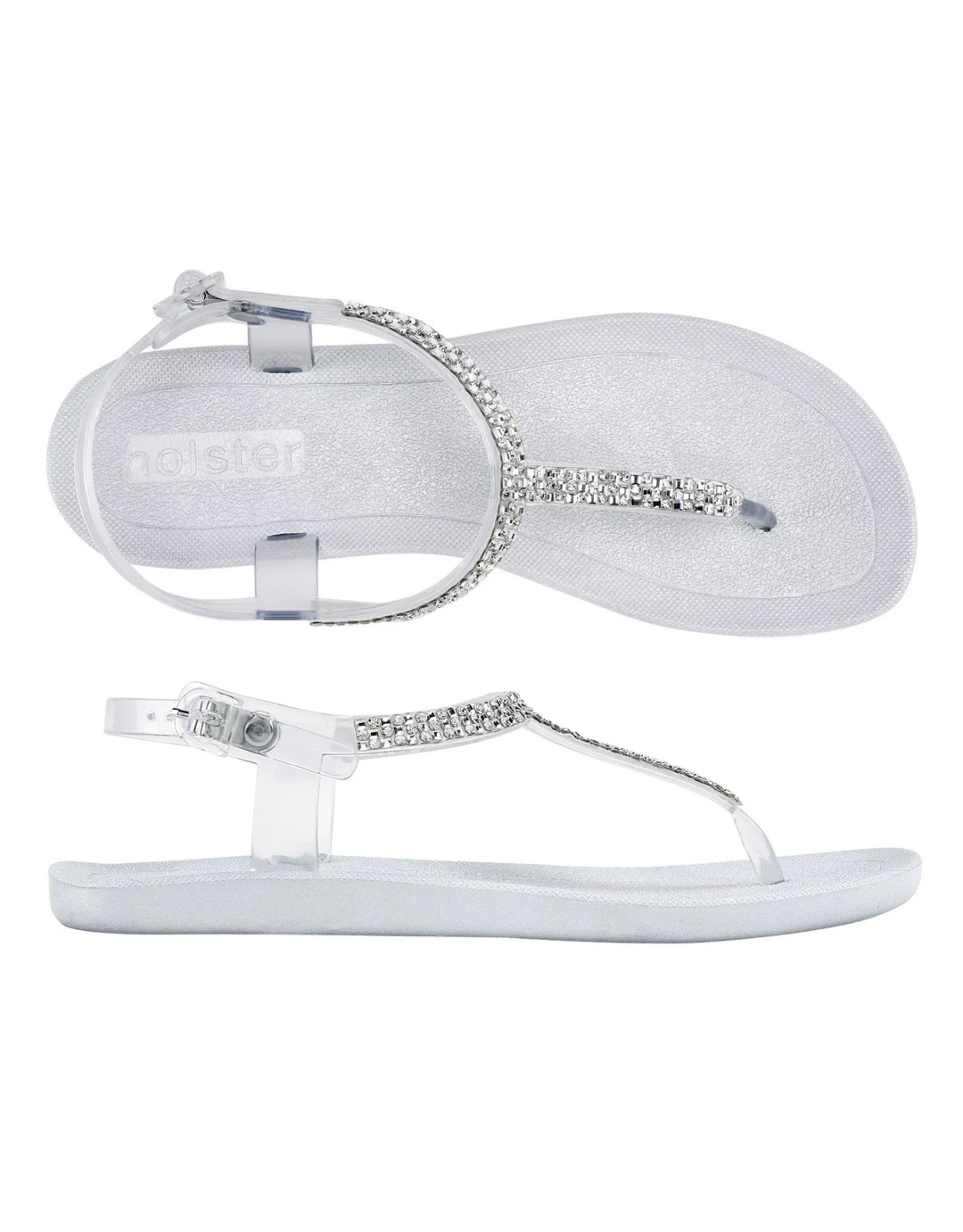 Enjoy sunlit days and moonlit nights in holster’s vegan air-foam sandal, Shari. An essential for ladies who enjoy luxe shoes with lots of comfort and style, Shari's sparkling rhinestone T-bar and adjustable ankle straps are flattering on the foot, while the shimmering footbed provides extra support and radiant glamour.