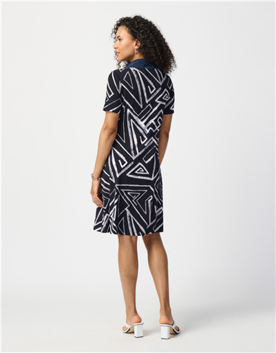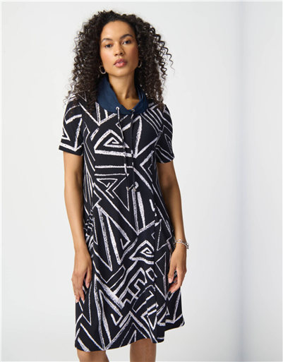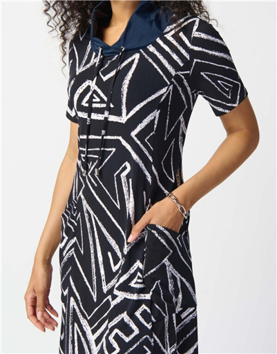 From Canadian label Joseph Ribkoff comes this frolicsome dress for summer, a style that's covered in a jagged abstract print. With drawstring detailing at the neckline and flattering short sleeves, this above-the-knee style is ultra-cute and ultra-flattering. What more could your summer style be looking for?
