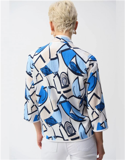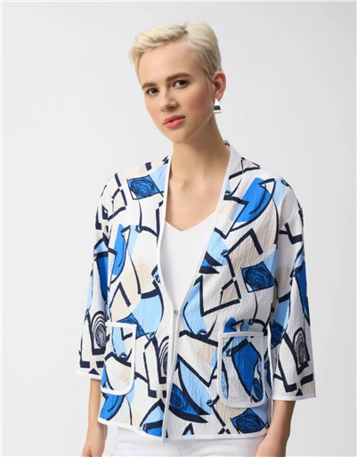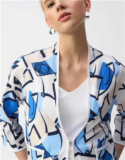 Discover the perfect blend of elegance and comfort with this Joseph Ribkoff blazer. Featuring a shawl collar and open front closure, this hip-length piece offers a regular fit that's ideal for both casual and office wear. The abstract pattern and 3/4 straight sleeves enhance its feminine, casual style, while functional pockets add practicality. Perfect for everyday overclothes, this blazer effortlessly elevates your wardrobe.