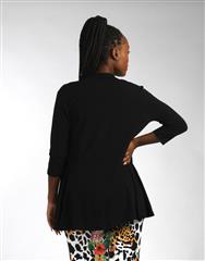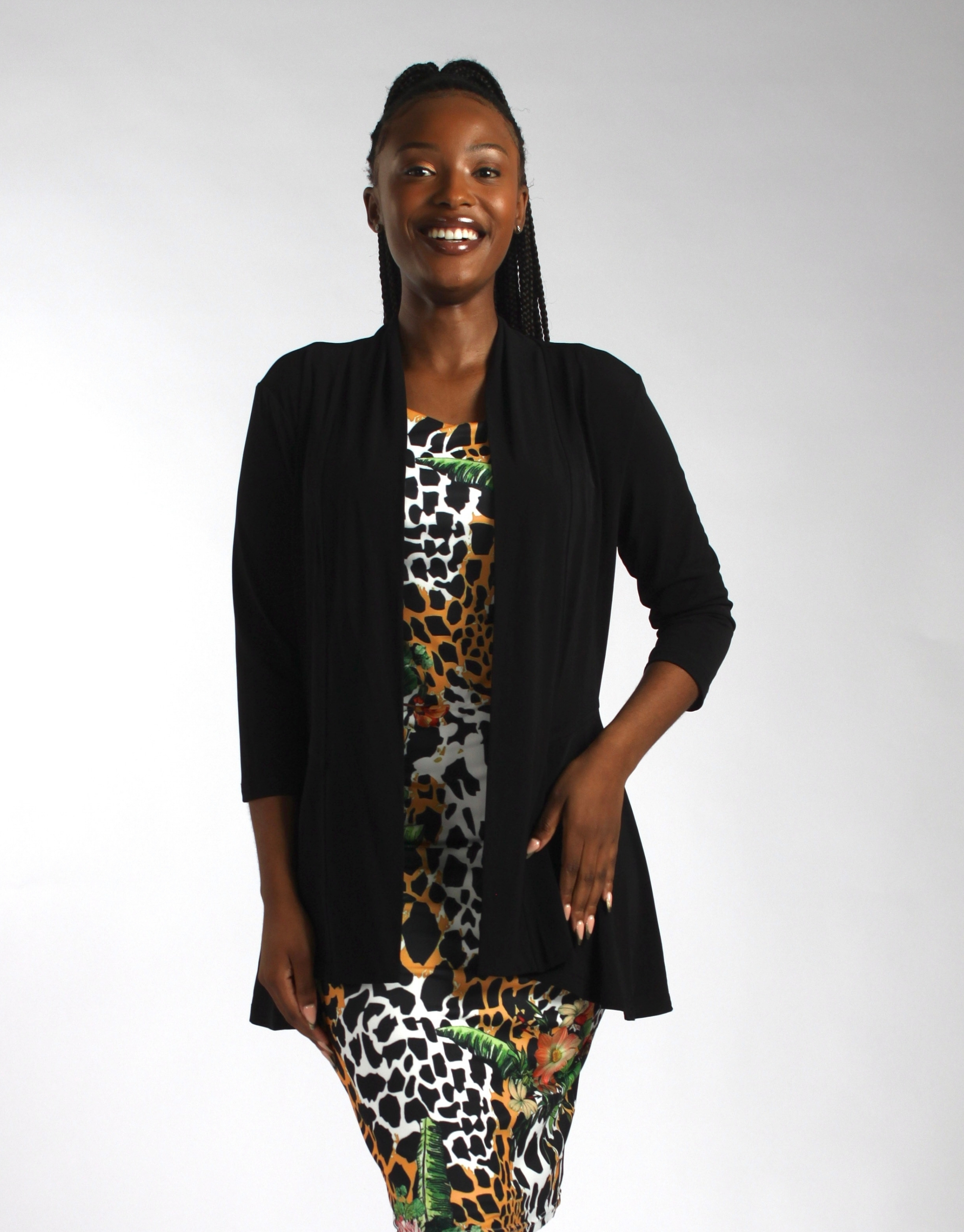 Soft drape open front jacket with a flattering longline fit and three quarter sleeves. Easy to layer, comfortable stretch knit, and a gently flared hem for an elegant finish.